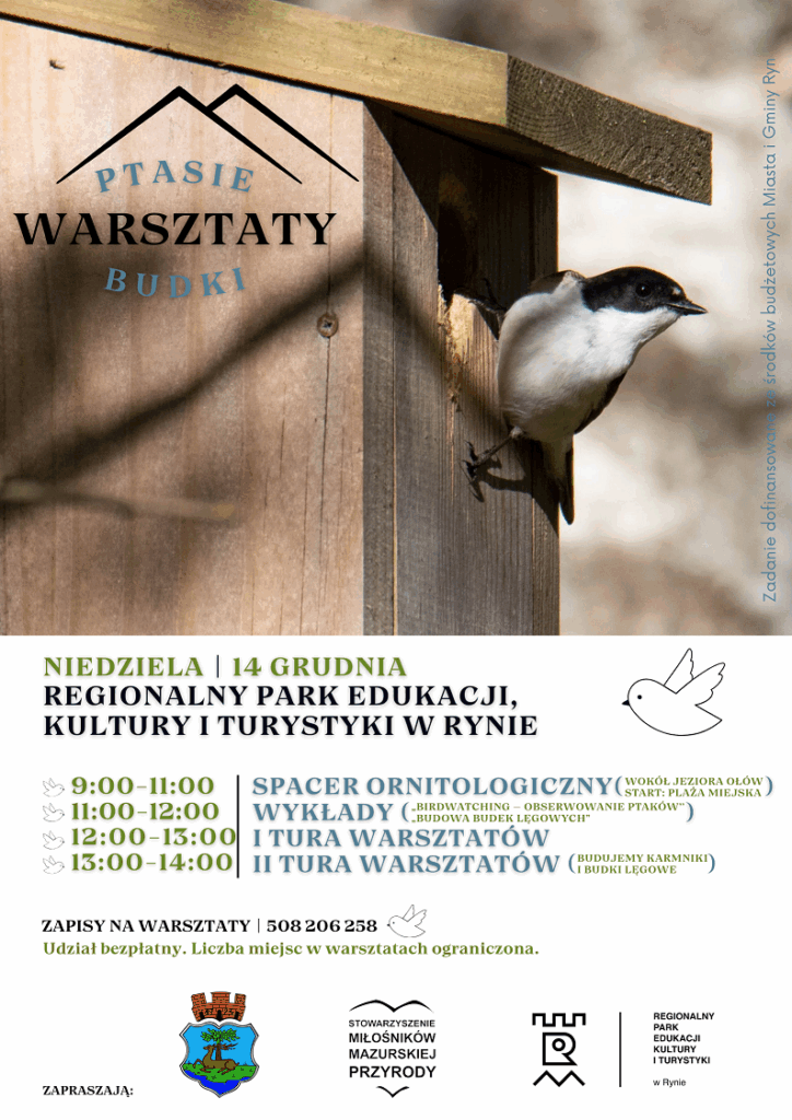 Zapraszamy do udziału w bezpłatnym cyklu wydarzeń „Ryńskie spotkania z ptakami”, poświęconych poznawaniu, ochronie i obserwowaniu ptaków zamieszkujących nasz region. Program obejmuje warsztaty rodzinne, wykłady ornitologiczne oraz spacer terenowy, dzięki którym uczestnicy będą mogli poszerzyć swoją wiedzę i zbliżyć się do fascynującego świata przyrody.